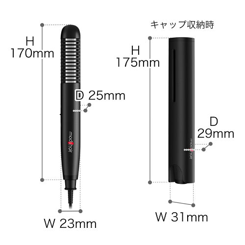 サイズ 本体:約 幅 23mm×奥行き 25mm×高さ 170mm キャップ含む:約 幅 31mm×奥行き 29mm×高さ 175mm プレート幅:約 12mm 重さ 本体:約 72g キャップ含む:約 110g コード長 約 1m 素材 本体:PET+30%グラスファイバー プレート内側:スチール( セラミックコーティング ) プレート外側:ステンレススチール キャップ:ポリカーボネート 電源 AC100-240V 給電方式 コンセント式( コード式 ) ・本製品は充電式ではありません。