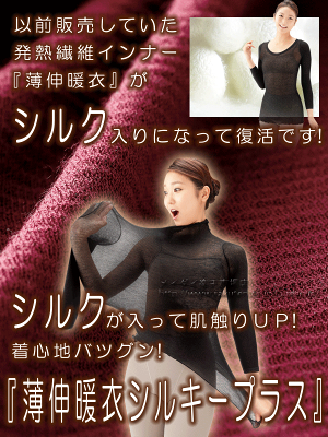 ババシャツ感覚で使うも良し!着ぶくれしないオシャレ着も良し! とにかくチクチクしない肌触りでシルクを使用しているからとっても気持ちいいインナー【発熱インナー】[薄伸暖衣シルキープラス/丸首タイプ] 薄くて暖かい発熱繊維インナー。