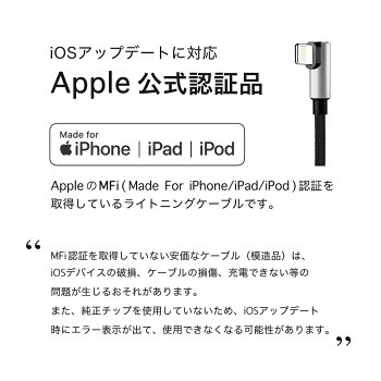 (MFi認定を受けていない製品は、アップデート時にエラーが 表示されたり、充電できない等の問題が生じるおそれがあります) ・ケーブルの長さが30cmで抵抗値を抑えられるため、 充電時間を短縮することができます。